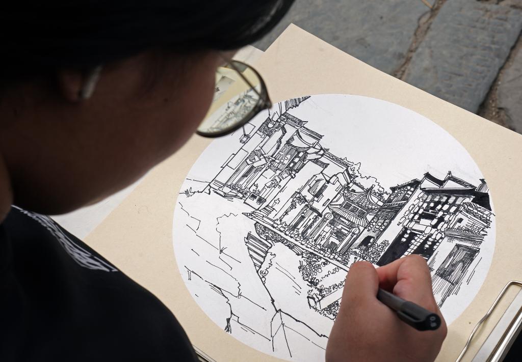 一位学生在李坑村写生(9月19日摄)。