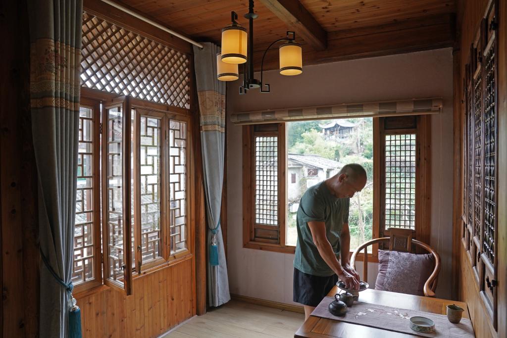 村民胡志武在自家开办的民宿里收拾房间(9月19日摄)。