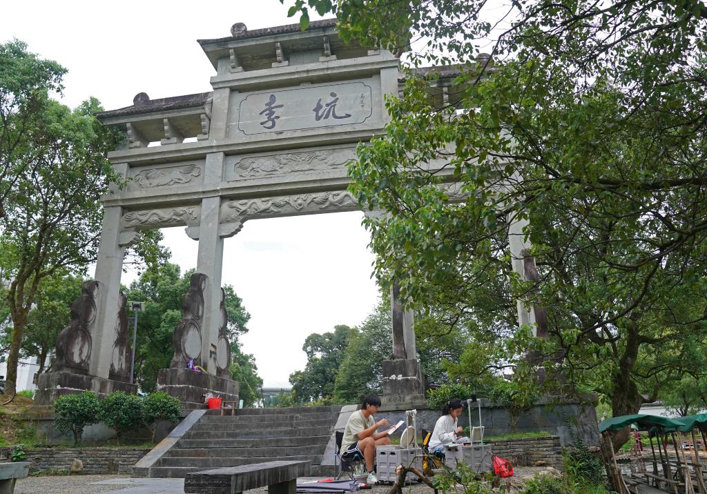 两位学生在李坑村村口写生(9月19日摄)。