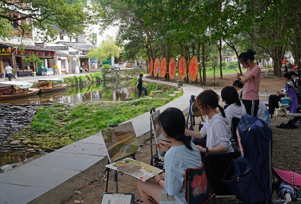 来自浙江的学生们在李坑村的小溪边写生(9月19日摄)。