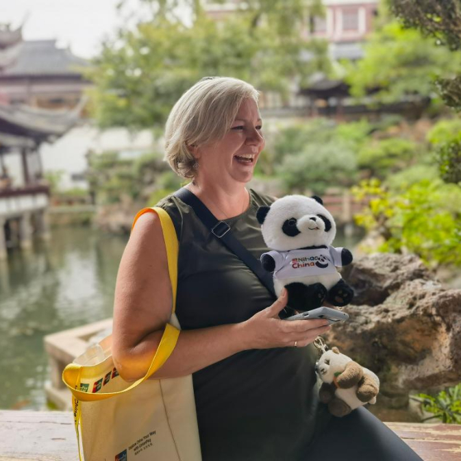 新华社上海9月22日电(记者陈爱平、赵晨捷)詹妮弗·切尔奈捧着可爱的熊猫毛绒玩具,坐在上海古典园林豫园曲折幽深的连廊上拍照。近处是亭台楼阁绿树曲水,远处有高耸如云的陆家嘴建筑——一眼望古今,这是她最喜欢上海的地方。