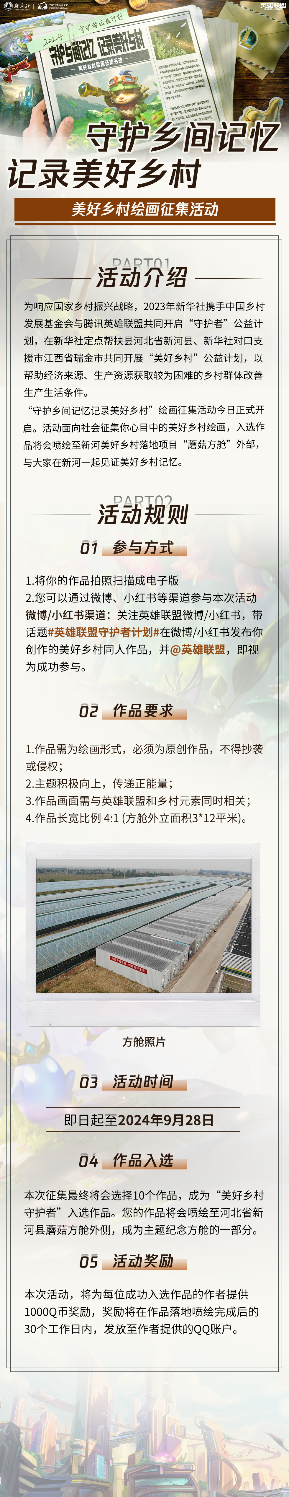 随着公益项目的逐步推进落地,近日,“守护乡间记忆 记录美好乡村”绘画征集活动启动,面向社会征集美好乡村主题绘画作品,入选作品将喷绘至新河美好乡村落地项目“蘑菇方舱”外部,留住美好乡村记忆。