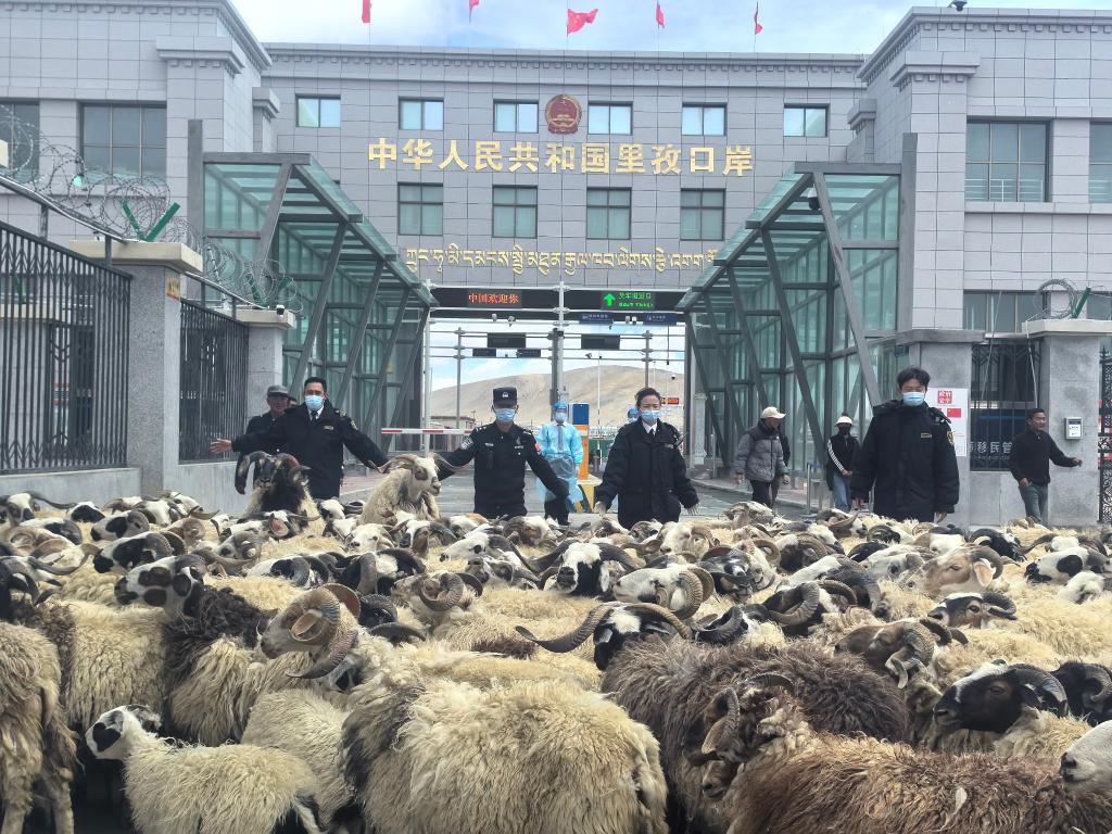 日喀则海关工作人员在里孜口岸监管活羊出口。(受访者供图)