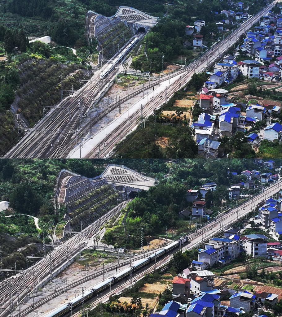 (拼版照片)上图:9月19日,高铁列车驶出渝厦高铁黔常段隧道,进入禾家村站。(无人机照片)下图:9月19日,一列普快列车驶出禾家村站。(无人机照片)新华社记者赵众志 摄