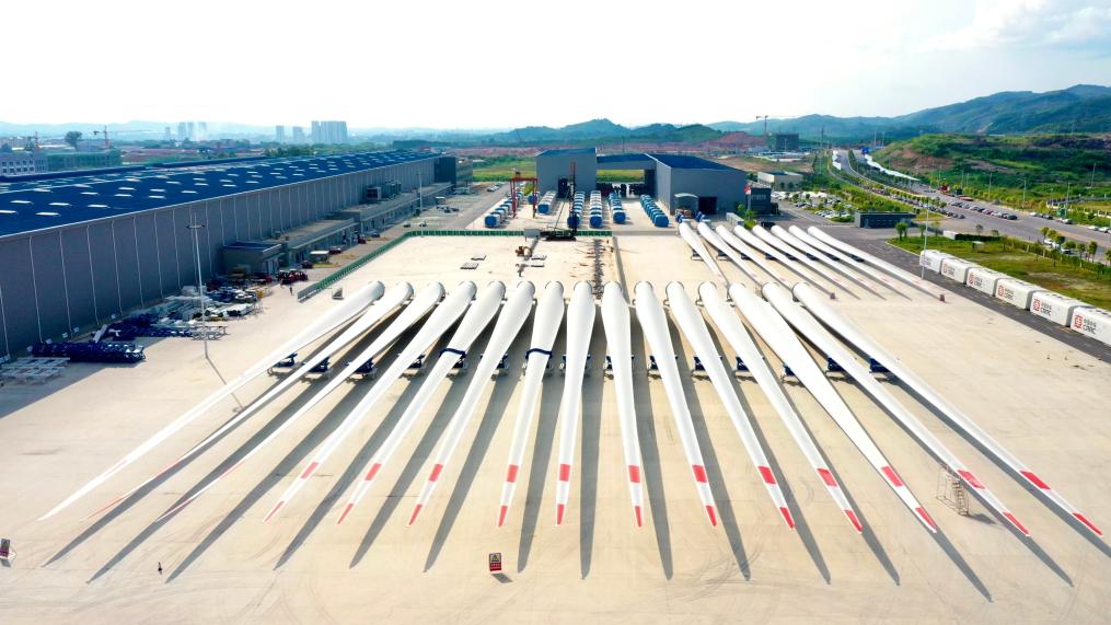 在百色市百东新区的中车百色新能源装备产业基地里,工人在各个作业区内忙碌工作,叶片、塔筒等风电装备制造产品整齐有序摆放在堆场上等待运输;百色中南光电高效智能新型光伏组件项目生产车间内,16秒下线一块光伏组件,从光伏组件到最终产品包装,生产全流程高度智能化……