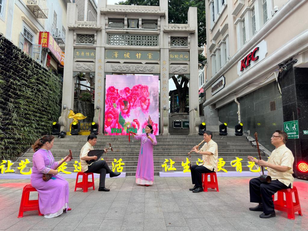 新华社厦门10月5日电(记者付敏)“南音太美妙了,婉转悠扬,韵味十足。”这个国庆假期,在厦门中山路的“泽被甘棠”石牌坊下,一场南音表演让来自湖南的刘丽婷感受到了闽南地区非遗文化的魅力。
