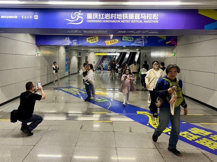 国庆前夕,这里刚举办了一场垂直马拉松。赛事带来品牌效应,前来打卡的人群络绎不绝。“垂直马拉松一般在摩天大楼里举办,如今地铁站里居然能跑马拉松,重庆总是能给游客带来惊喜。”来自河北的游客张楠说。