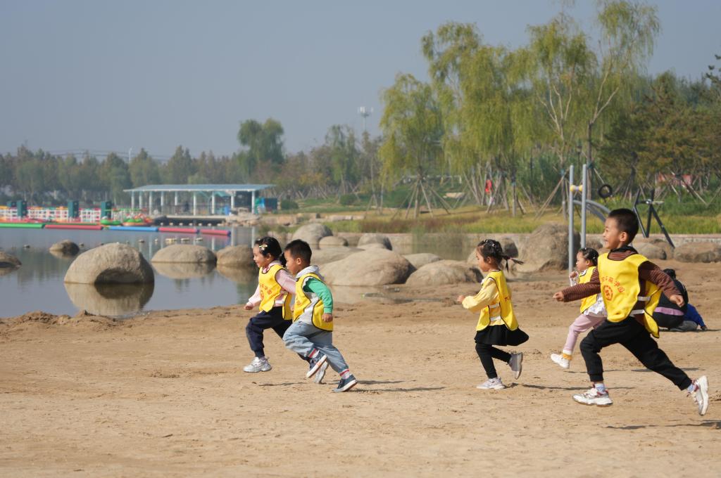 10月12日,在东营市东营区泮水公园,孩子们在湿地边玩耍。