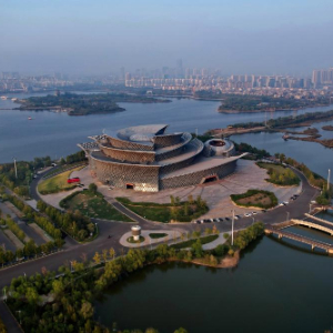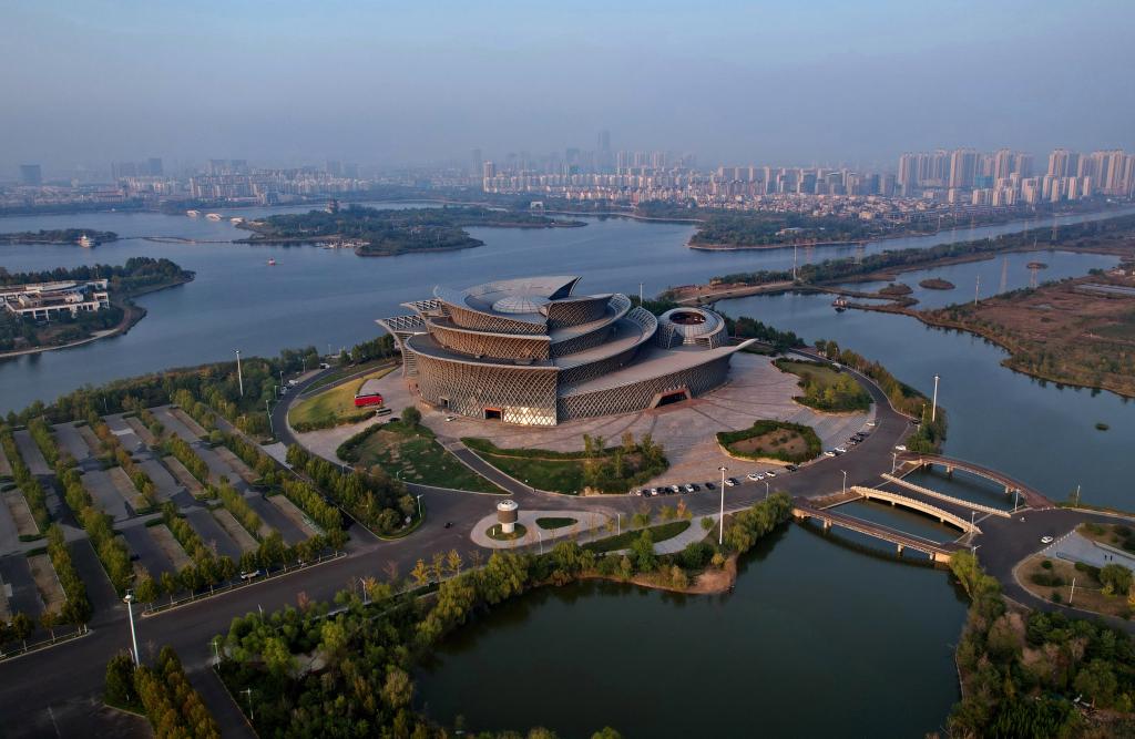 这是位于东营市的雪莲大剧院和周边湿地(10月12日摄,无人机照片)。