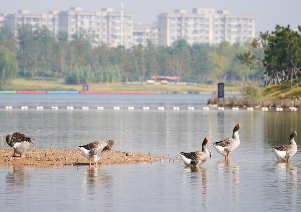 10月12日,在东营市东营区泮水公园,一群雁鹅在湿地内栖息。