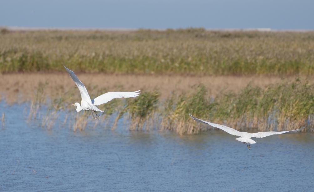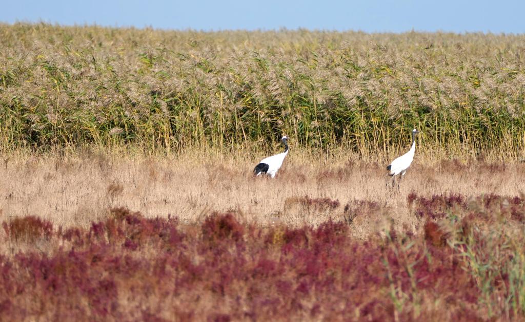 10月11日,在东营市垦利区,野生鸟类在湿地栖息。