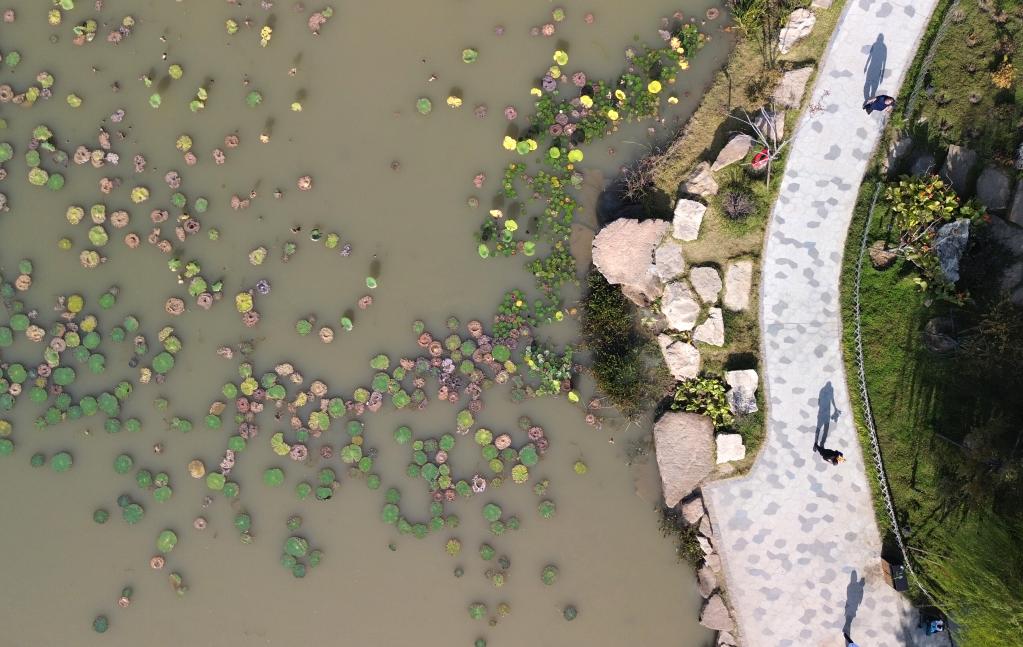 10月12日,在东营市东营区泮水公园,市民在游览湿地景观(无人机照片)。