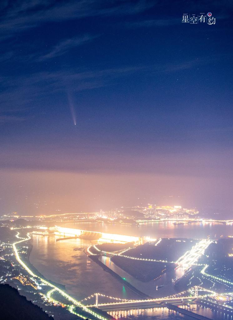 2024年10月14日在湖北宜昌夷陵区拍摄的紫金山-阿特拉斯彗星与三峡大坝“同框”。(雷勇摄)