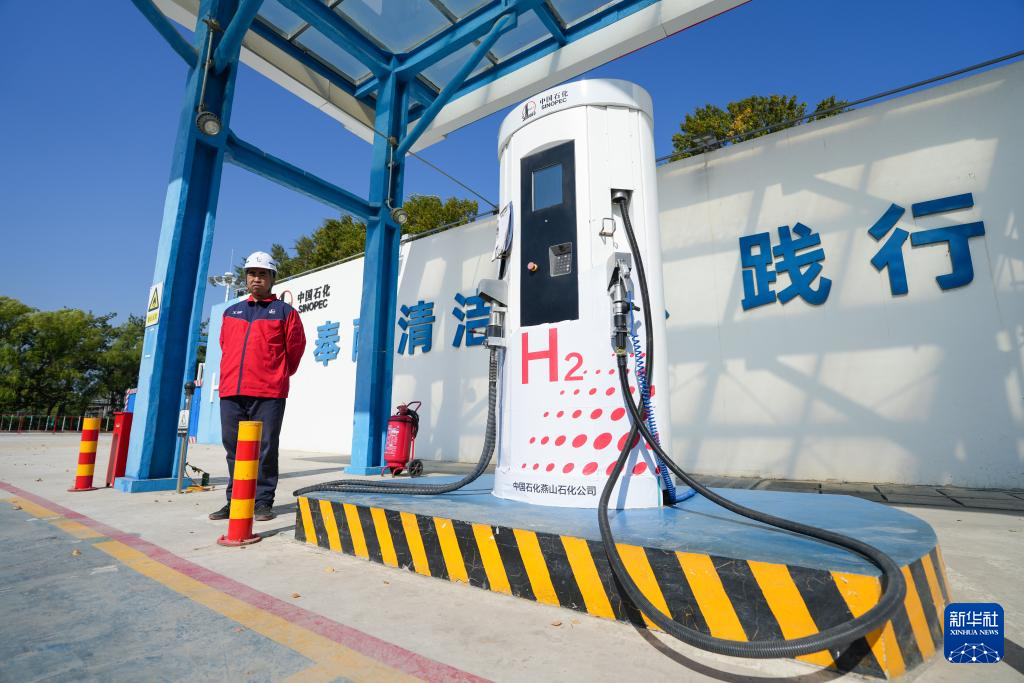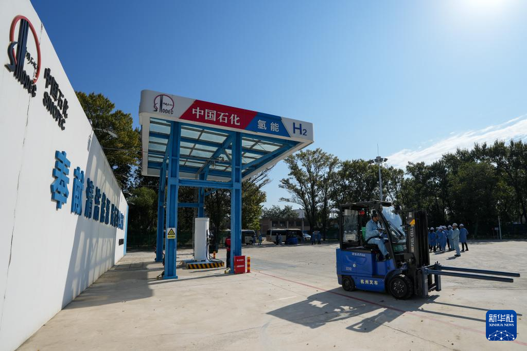 10月15日,在中国石化燕山石化公司的加氢站,一名工作人员在为一辆氢能叉车加氢气。新华社记者 鞠焕宗 摄