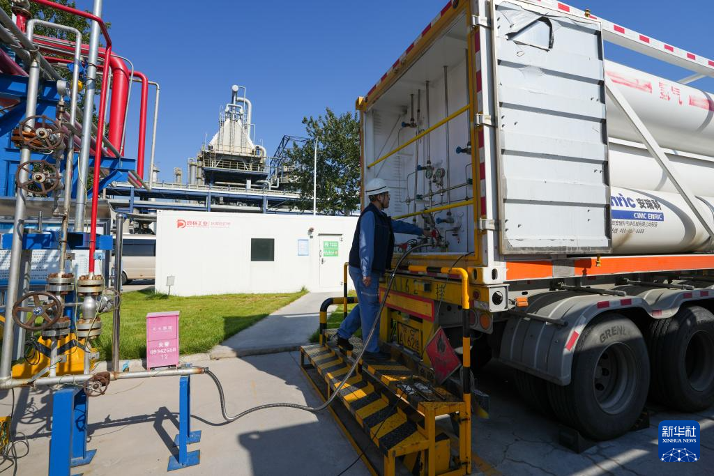 10月15日,在中国石化燕山石化公司,一名工作人员在给一辆氢气管束车充装氢气。新华社记者 鞠焕宗 摄
