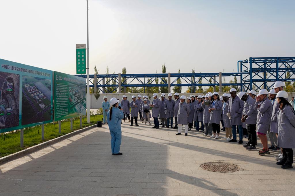 2024年10月16日,外国嘉宾在位于新疆阿克苏地区库车市的中国石化新星公司库车绿氢示范项目参观。新华社记者 陈朔 摄