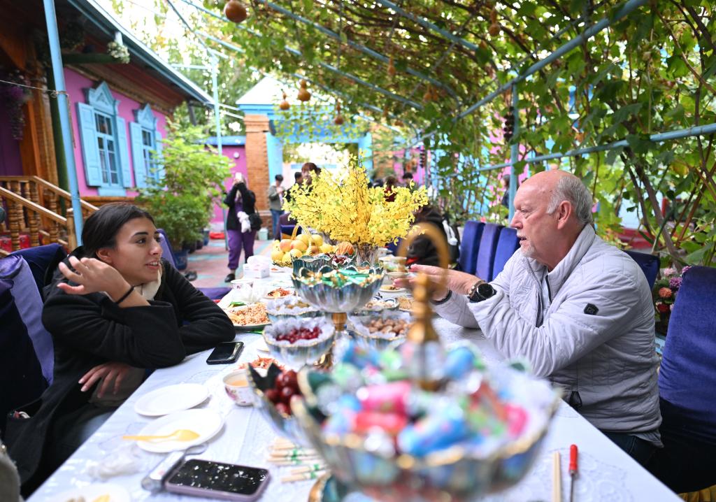 2024年10月15日,外国嘉宾在伊宁市喀赞其民俗旅游区参访。新华社记者 李响 摄