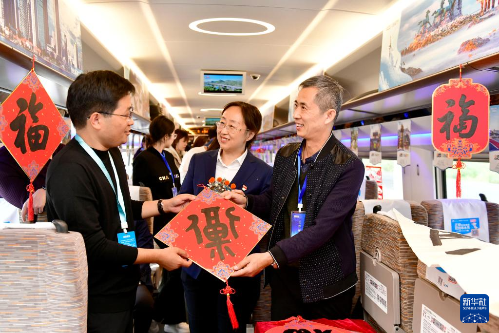 10月21日,在潍烟高铁复兴号G9227首发列车上,烟台文旅部门的工作人员向潍烟高铁参建者送礼物。新华社记者 郭绪雷 摄