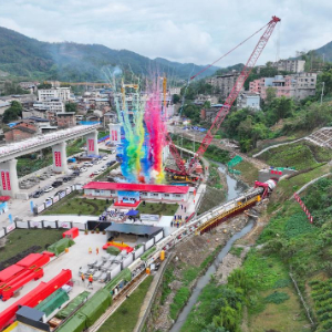 合川东隧道出口泄水洞盾构机总长120米,总重约280吨,盾构成功始发,为我国高铁建设小断面辅助坑道穿越特殊地理条件提供了宝贵经验。