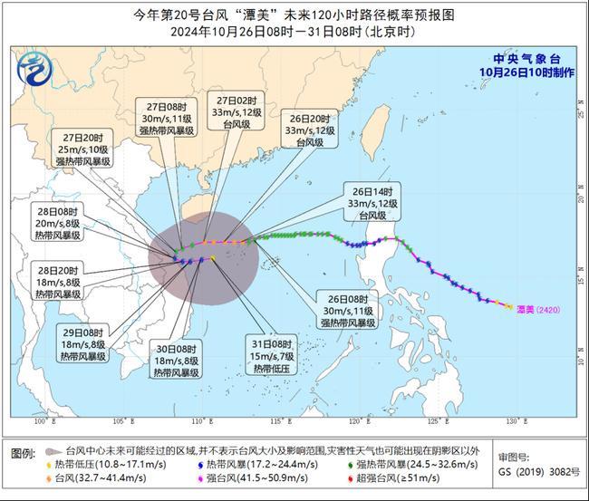 预计,“潭美”将以每小时15-20公里的速度向偏西方向移动,强度还将有所加强,最强可达台风级(33-35米/秒,12级),27日夜间开始在南海中西部回旋少动,强度逐渐减弱。
