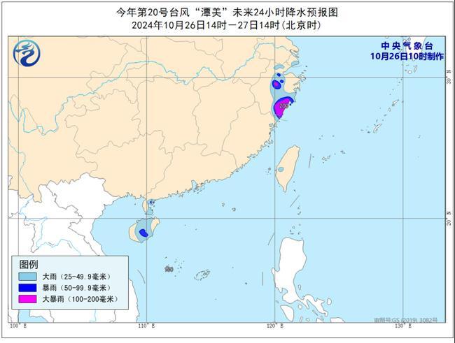 降水预报:26日14时至27日14时,上海南部、浙江、广东西南部、海南岛、台湾岛西部、西沙群岛等地有大到暴雨,其中浙江中部和南部、西沙群岛的部分地区有大暴雨(100-200毫米)。