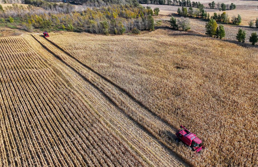 10月21日,在通辽市科尔沁区钱家店镇,农机手驾驶收割机在田间收获玉米(无人机照片)。(受访者供图)