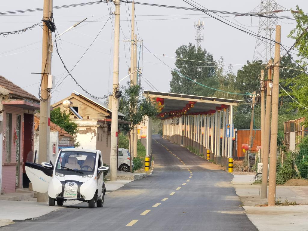 在潍坊市坊子区坊安街道祥疃村,架设在村子主干路上方的光伏长廊。新华社记者 王志 摄