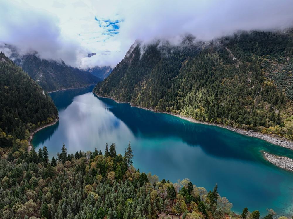 从高空中俯瞰,树正沟、日则沟和则查洼沟3条主沟呈不规则的“Y”字形躺卧于九寨沟起伏的峰峦之间。数以万计的游客散落在绵延40多公里的狭长沟谷内,却并不显得拥挤。