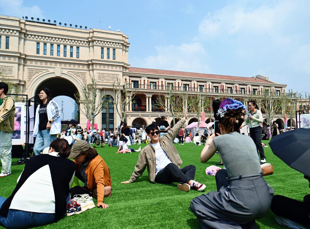 4月13日,游客在天津市五大道民园广场休闲游玩。新华社记者 赵子硕 摄