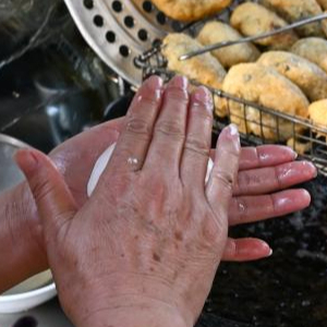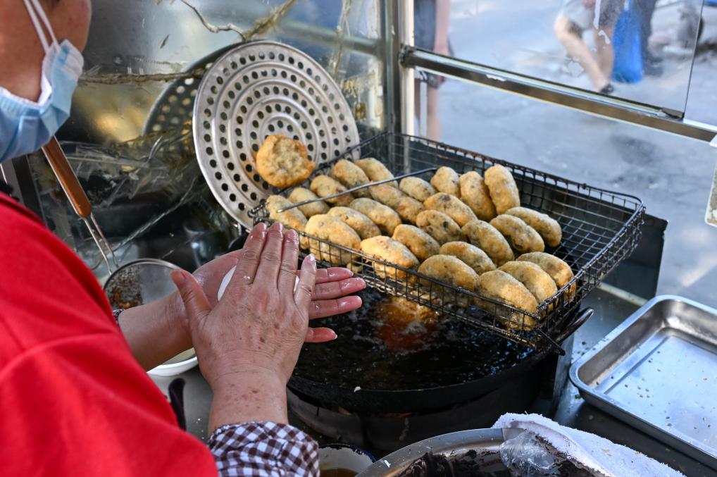 2023年7月10日,在天津市红桥区西关大街一家早点铺,商家在制作炸糕。新华社记者 孙凡越 摄