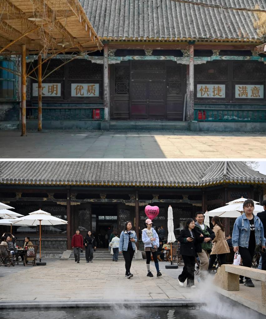拼版照片:上图是修缮前的五大道樘院(资料照片);下图是4月10日拍摄的修缮后的五大道樘院内游人络绎不绝。新华社记者 李然 摄