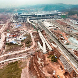 这是11月2日拍摄的渝厦高铁重庆东站正线铺轨施工现场(无人机照片)。新华社记者 唐奕 摄