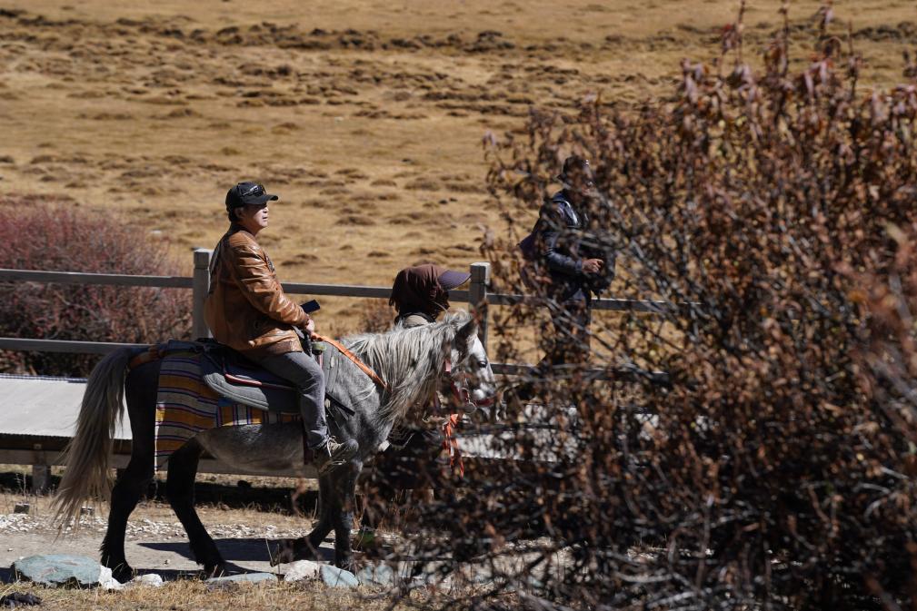 10月31日,游客在四川省甘孜藏族自治州稻城亚丁景区内骑马。新华社记者 胥冰洁 摄