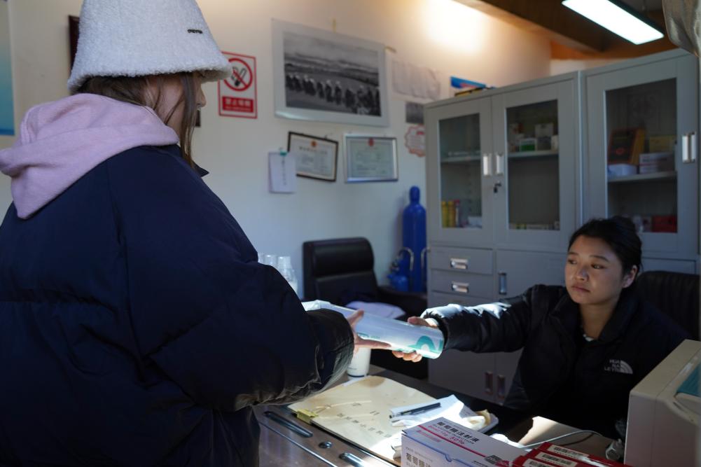 10月31日,在四川省甘孜藏族自治州稻城亚丁景区内的医疗服务站,工作人员(右)为游客提供氧气瓶。新华社记者 胥冰洁 摄