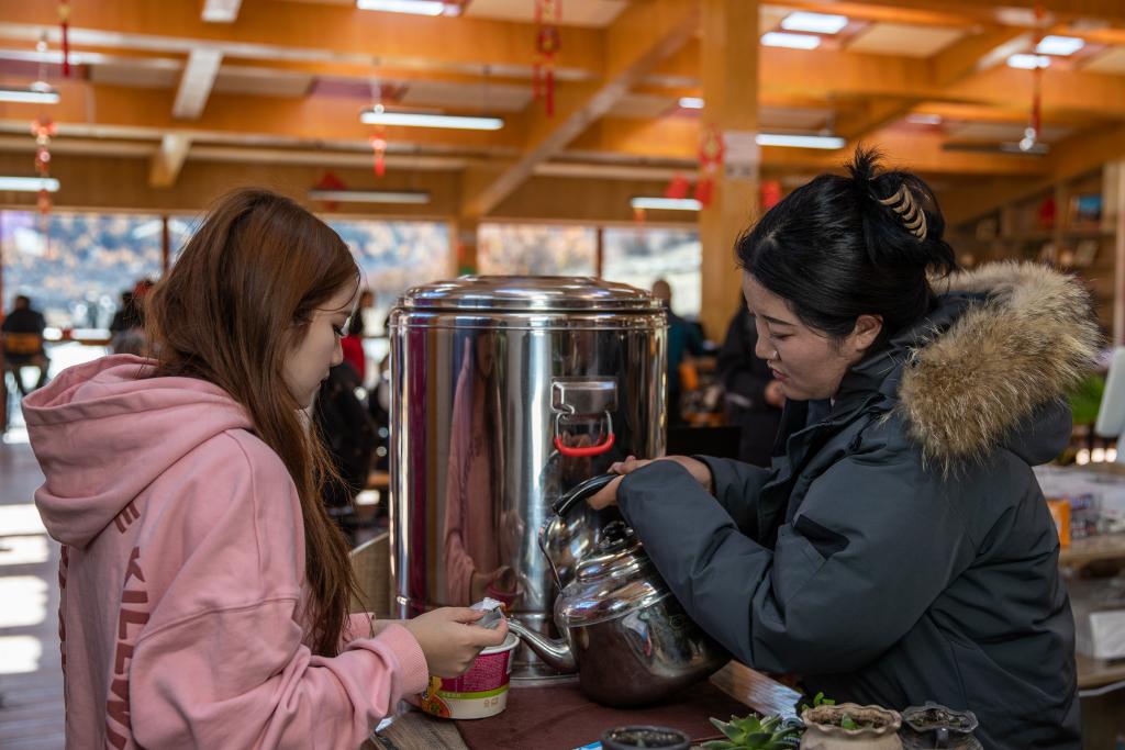 10月31日,在四川省甘孜藏族自治州稻城亚丁景区,工作人员在“亚丁驿站”为游客倒热水。新华社记者 储加音 摄