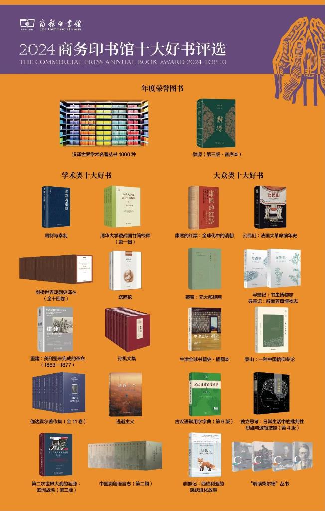 2024商务印书馆十大好书日前在京发布。“汉译世界学术名著丛书1000种”、《辞源》(第三版·音序本)被评为年度荣誉图书,《周制与秦制》《清华大学藏战国竹简校释》(第一辑)等获评年度学术类十大好书,《藏春:元大都规画》《古汉语常用字字典》(第6版)等获评年度大众类十大好书。