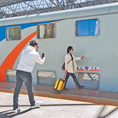 旅客在双层列车前拍照打卡。李文雯摄