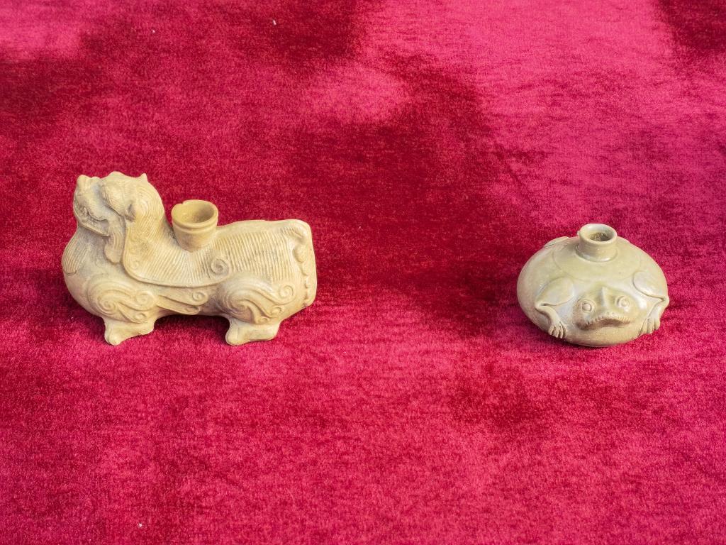 张昭家族墓出土的青瓷狮形插器(左)、青瓷蛙形水注(右)。新华社记者 邱冰清 摄