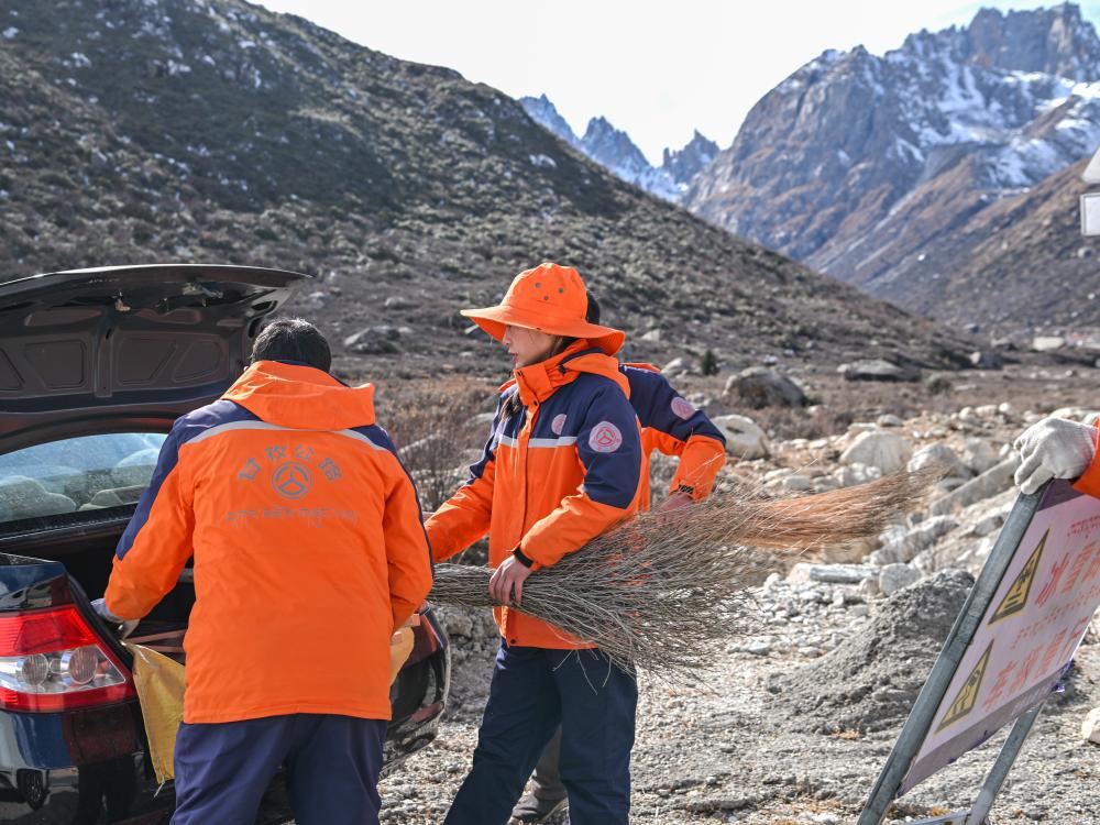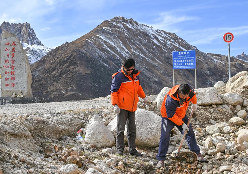 11月1日,黎平(右)和同事在国道317雀儿山段清理路边的沟渠。新华社记者 王曦 摄
