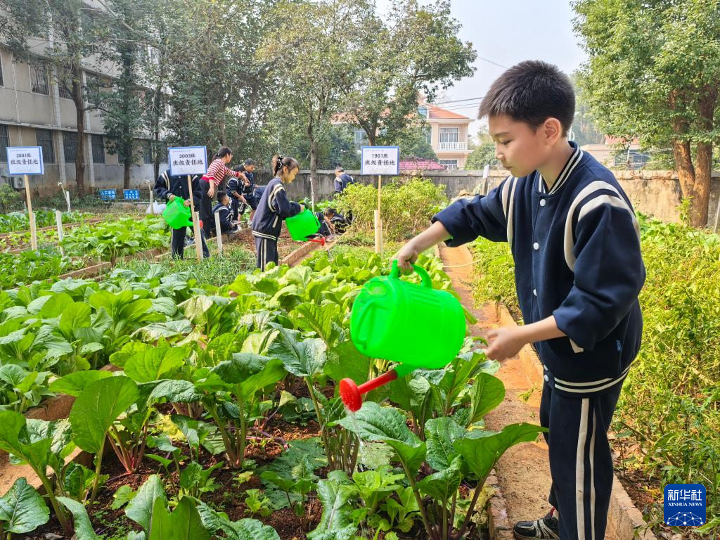 11月14日,在湖南省宁乡市菁华铺乡中心小学的劳动实践基地里,学生在给蔬菜浇水。 新华社记者 程济安 摄