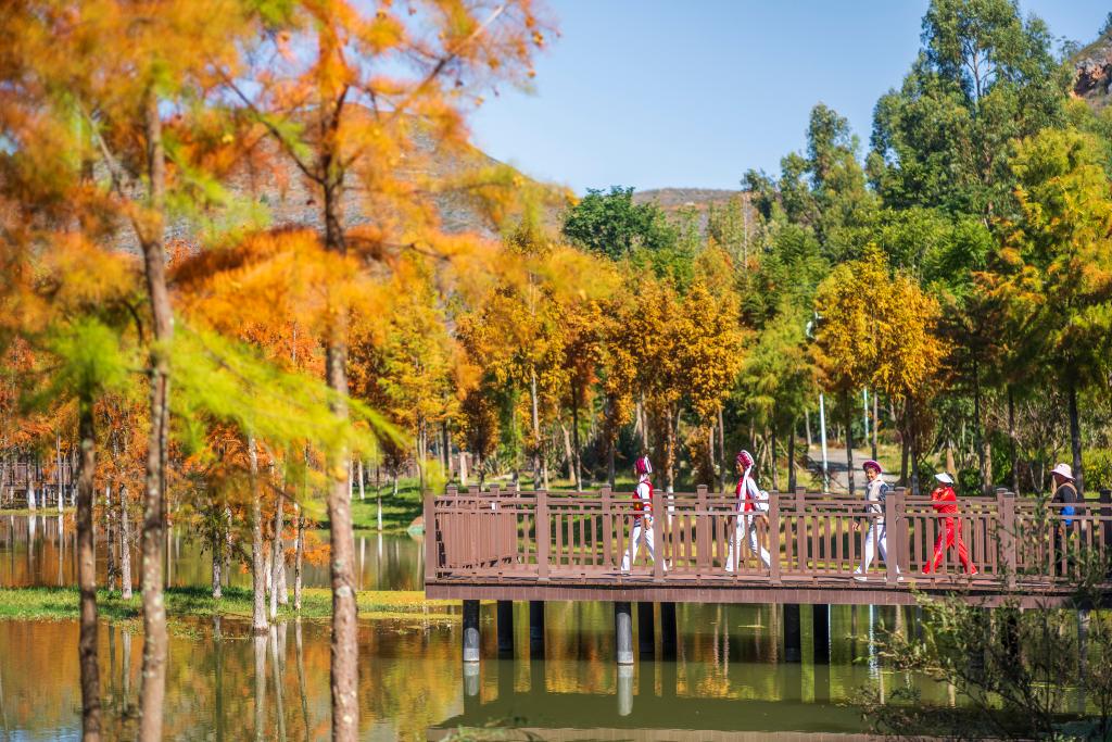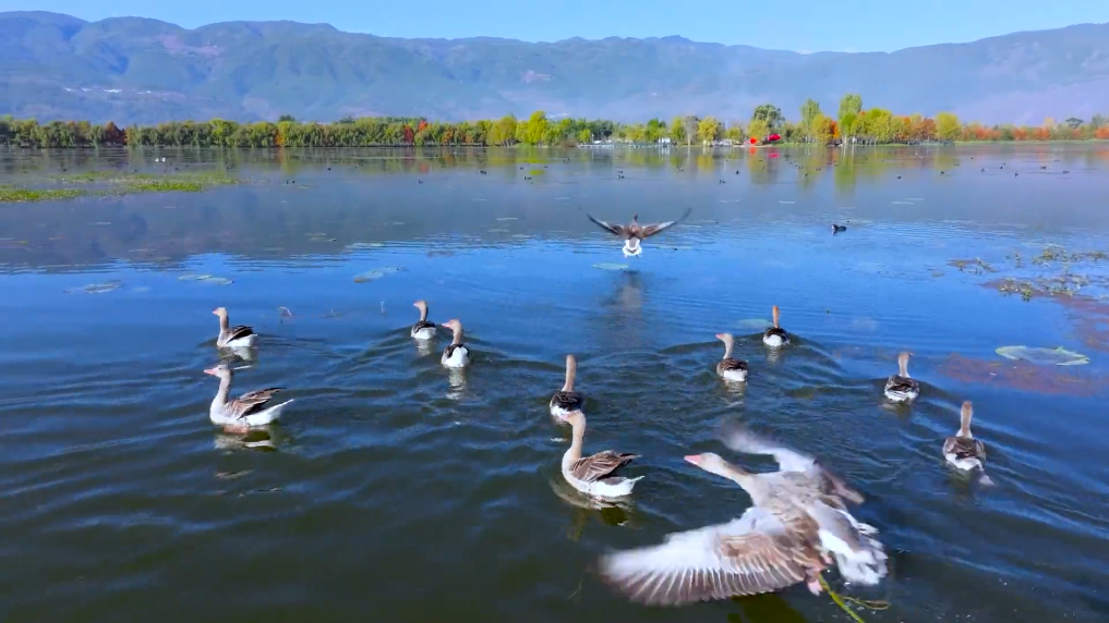 初冬时节,云南省大理白族自治州洱源县的茈碧湖湿地景色宜人,层林披上了斑斓冬装,山水交相辉映,候鸟翩跹起舞,绘就了一幅动人的自然画卷,众多游客纷至沓来。