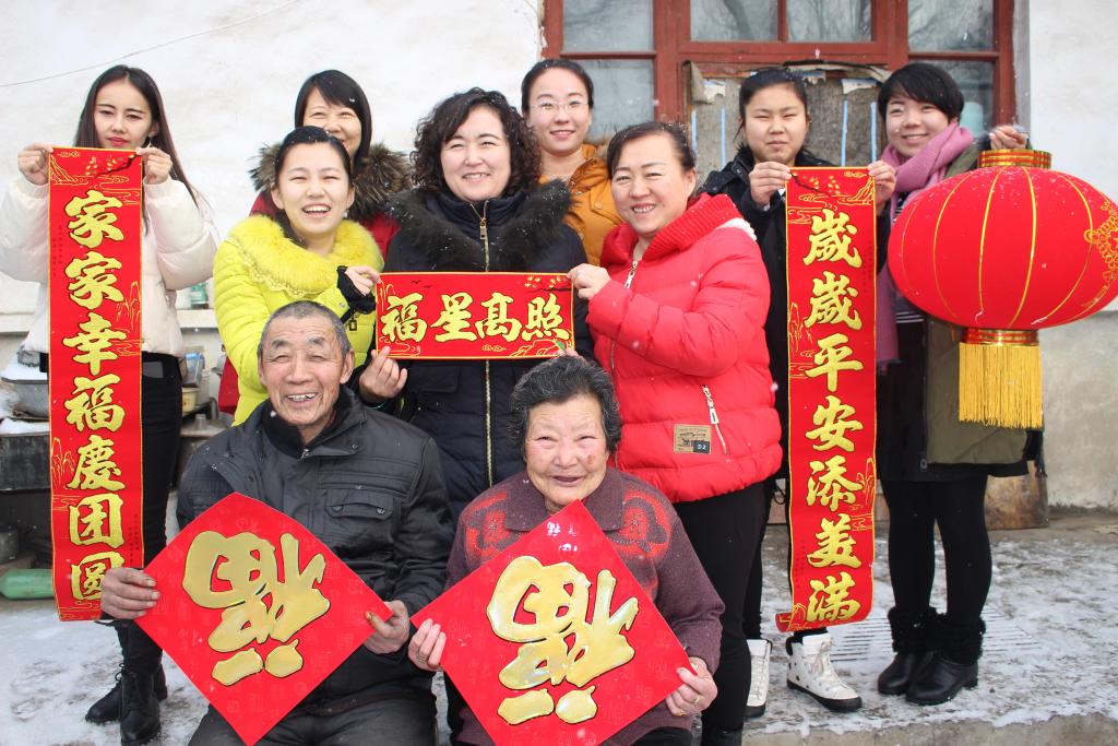 巴哈义古丽和社区志愿者与刘国群夫妇在春节期间的合影。新华社发