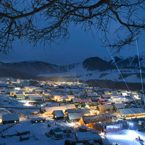 夕阳沉入西边山峦,夜幕降临,延绵雪峰下,禾木村被暖色灯光照亮,分外迷人。座座小木屋内,欢笑声中流露出冰雪旅游的热气,升腾不息。