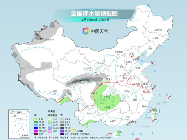 明天,西北地区的降雪将发展增多,新疆北部和西部、西藏西部和东南部、青海南部、甘肃南部、川西高原北部和东部等地部分地区有小到中雪或雨夹雪,其中,新疆塔城和伊犁河谷、西藏西南部、青海南部等地部分地区有大雪,局地暴雪。四川东部、重庆南部、湖南西部、贵州、云南南部、海南岛东部、台湾岛东部等地部分地区有小雨,其中,台湾岛东北部有中雨。