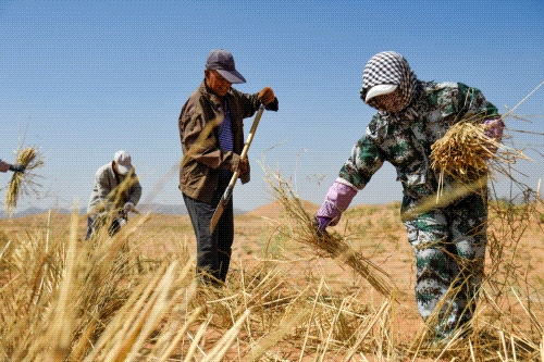 中卫人民在实践探索中创造出被誉为“治沙魔方”的麦草方格技术(资料照片)。新华社发