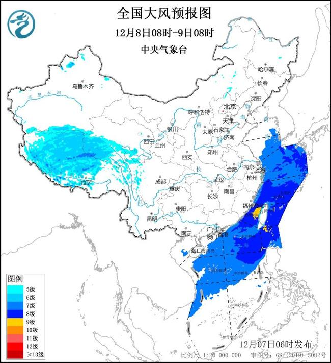 12月8日08时至9日08时,内蒙古东部、浙江东部沿海、西藏中西部、青海西南部、川西高原等地部分地区有5~6级风,阵风7~8级;黄海东南部海域、东海大部海域、台湾海峡、台湾以东洋面、巴士海峡、南海北部、中部和西南部海域海域将有7~8级、阵风9级的大风,其中台湾海峡、台湾以东洋面和巴士海峡部分海域的风力可达9级、阵风10级。