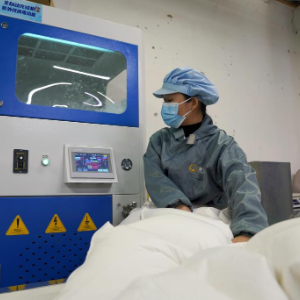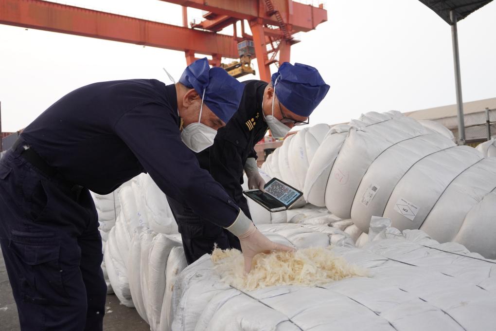 海关工作人员正在对水洗羽毛羽绒进行检查。新华社发