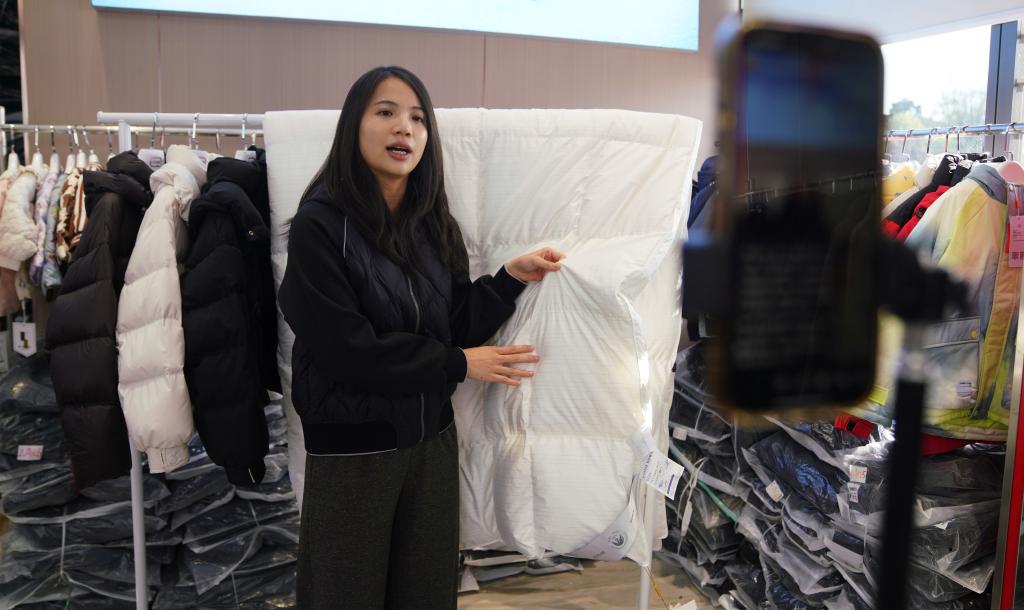 在桥圩羽绒产业园展示厅,销售人员正在直播介绍当地生产的羽绒被。新华社记者 杨驰 摄