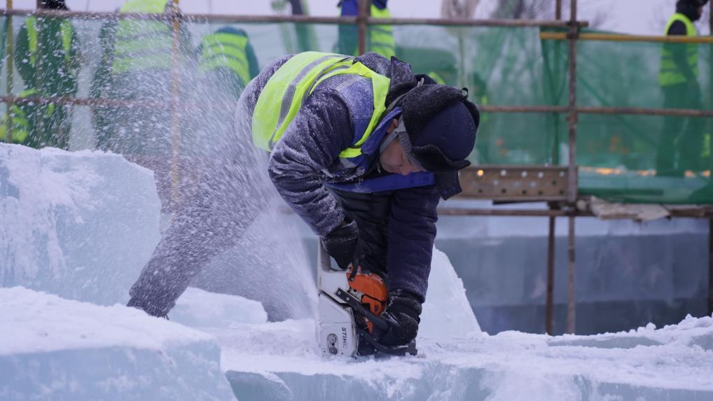 冰为砖、水为泥、灯为饰,打基础、做钢架、砌冰墙。一层层脚手架随着冰建筑慢慢升高,工人们手拿铲子、锉子,将每一块冰打磨得光滑透亮,五颜六色的灯饰嵌入事先开凿的冰槽内,为透明的大冰块注入斑斓的色彩。