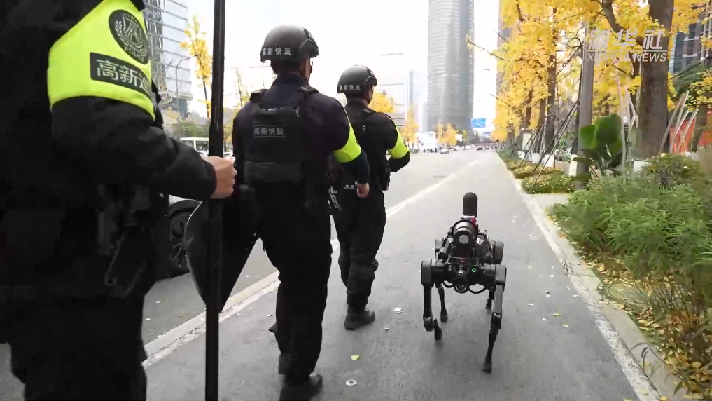 这是成都高新公安在全市首批次运用“无人机+武装警力+机器狗”的“空地一体化”巡逻模式。